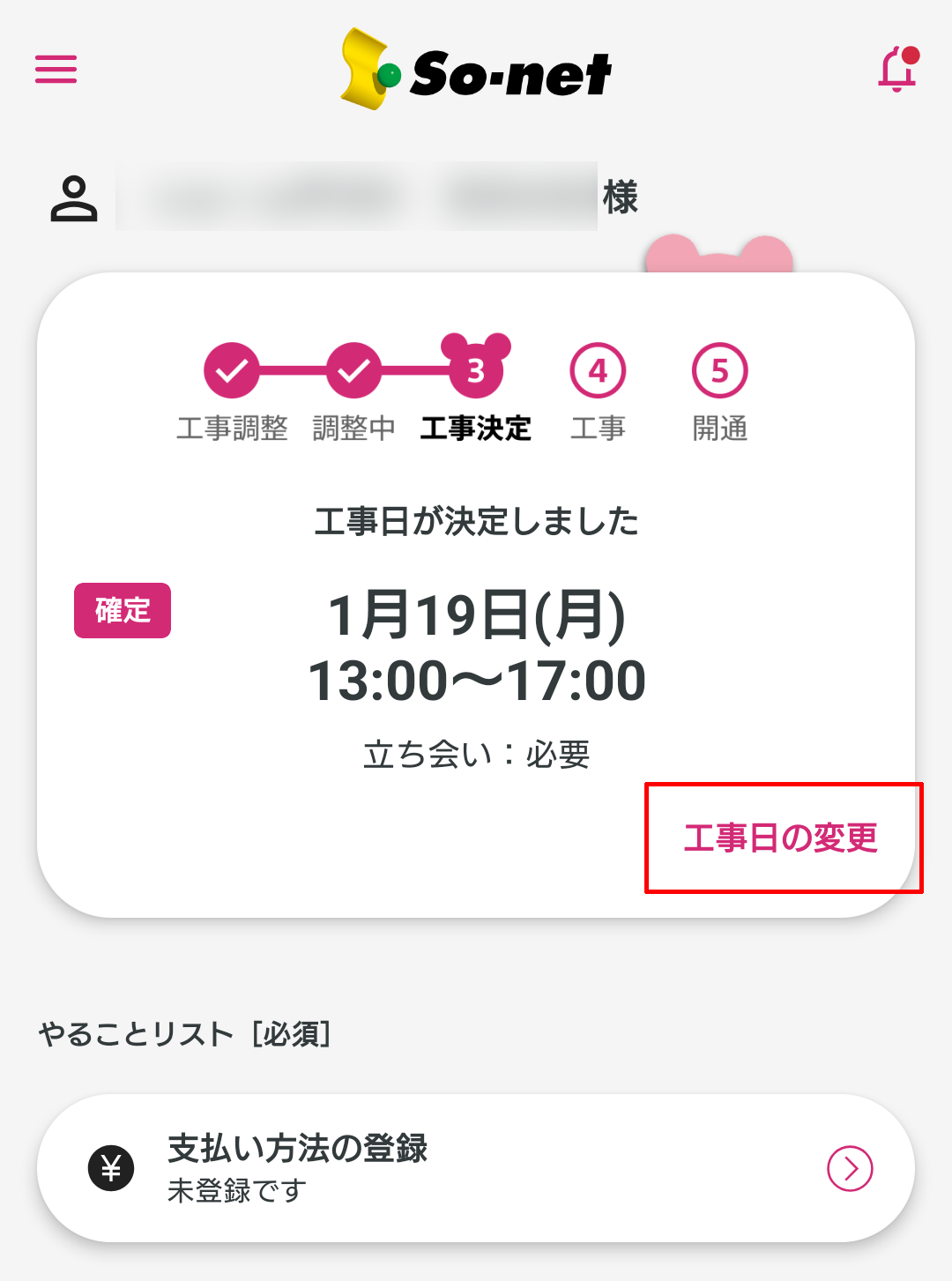So-net 会員アプリのホームタブの「工事日の変更」よりお問い合わせ方法などご確認ください。