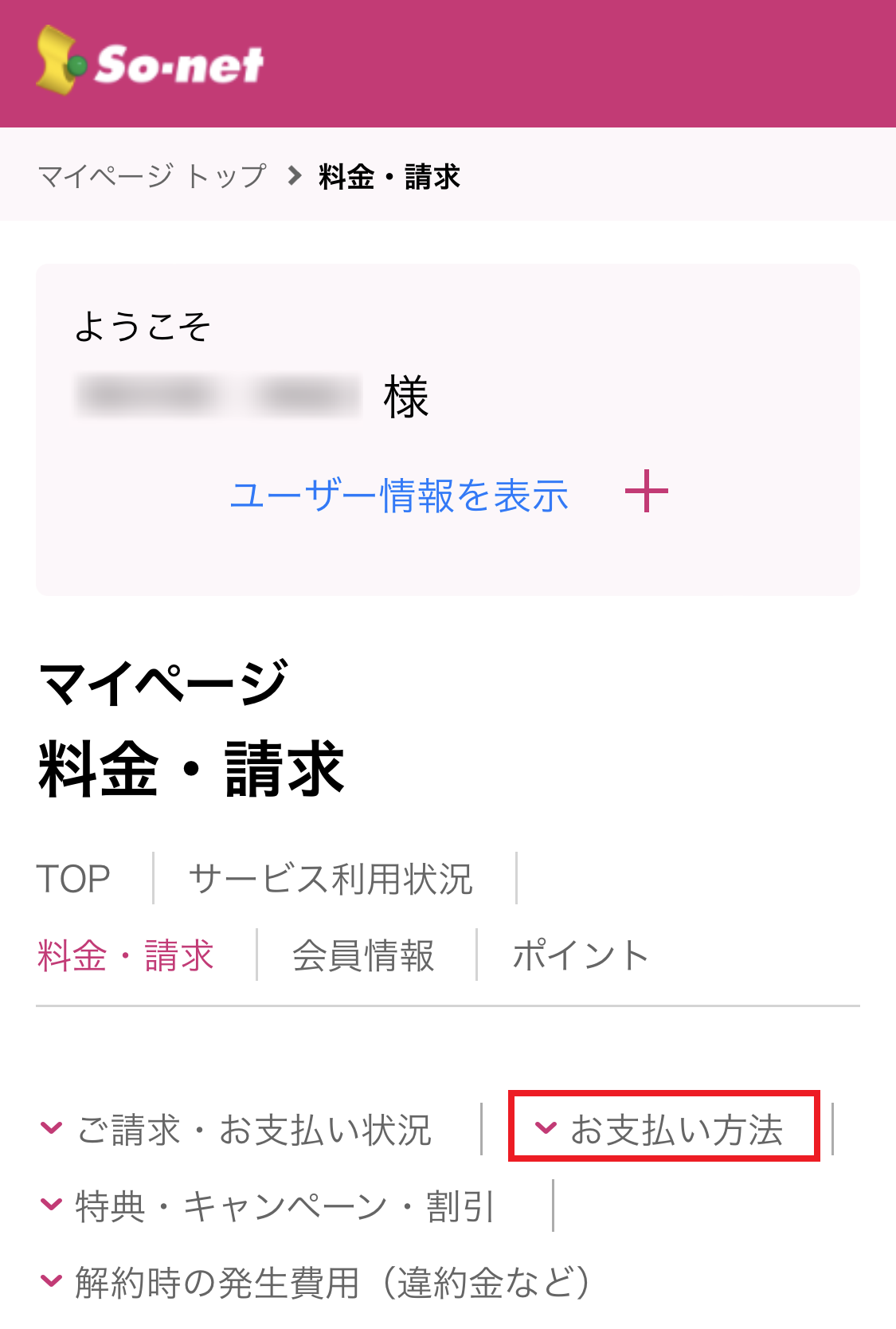 お支払い方法の変更については、マイページや、So-net 会員アプリにて登録、確認、変更が可能です。