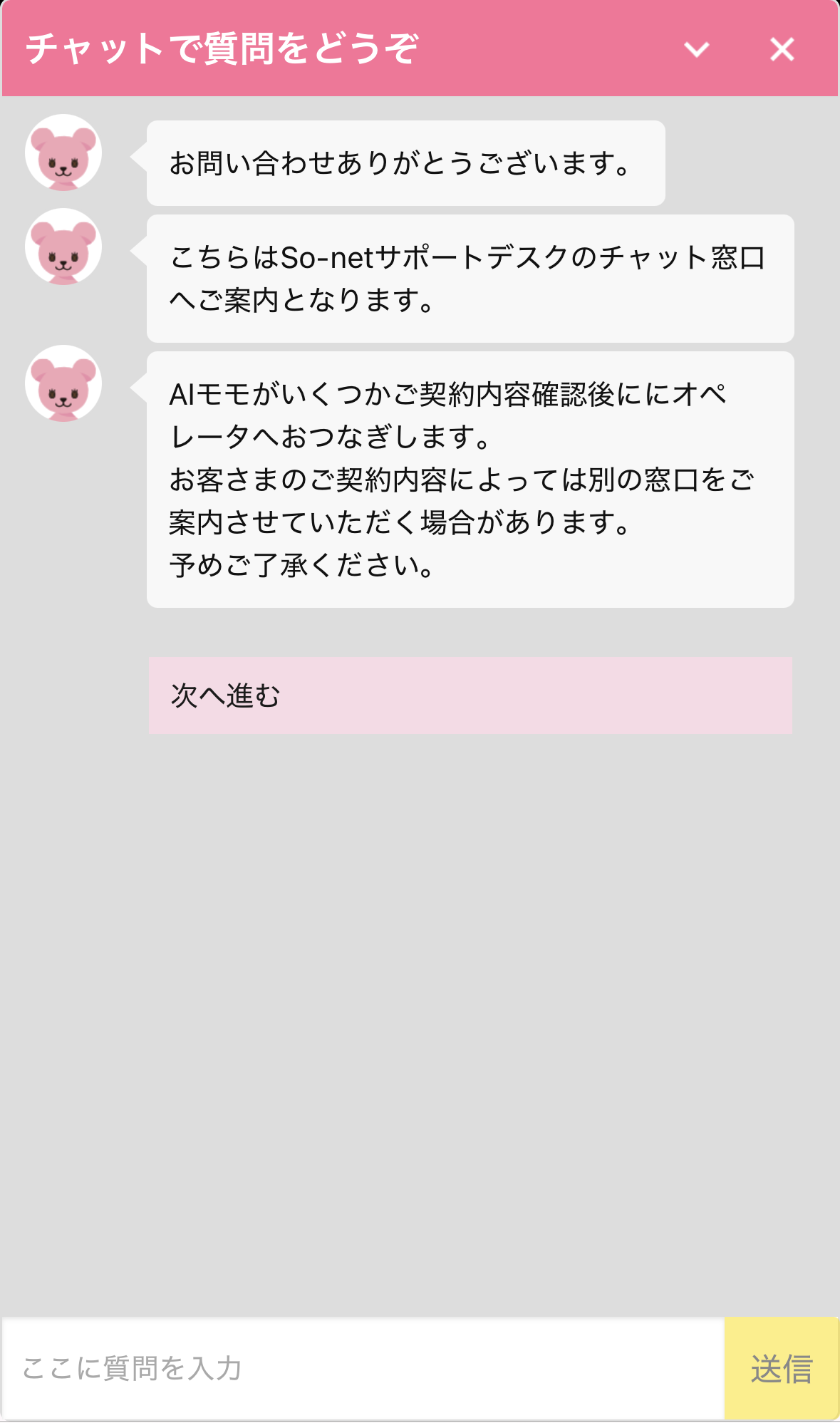 AIモモの確認後、「オペレータに接続する」をご選択いただくと、チャット窓口につながります。
