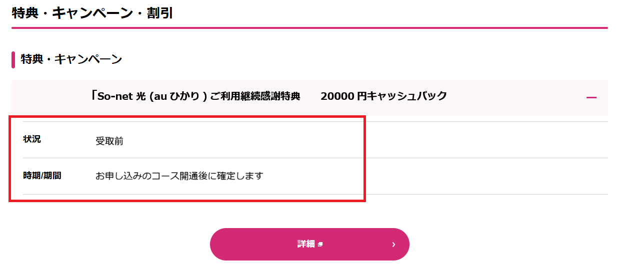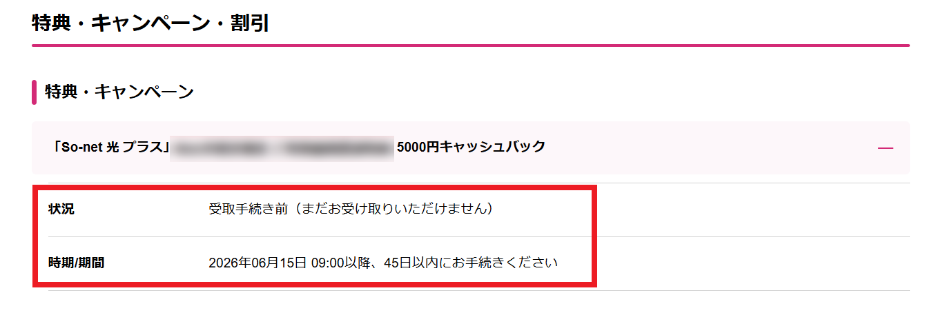 ご契約いただいたコースが開通後、マイページまたは So-net 会員アプリから「キャンペーン」のページにて、お受け取り手続き可能な時期がご確認いただけます。
