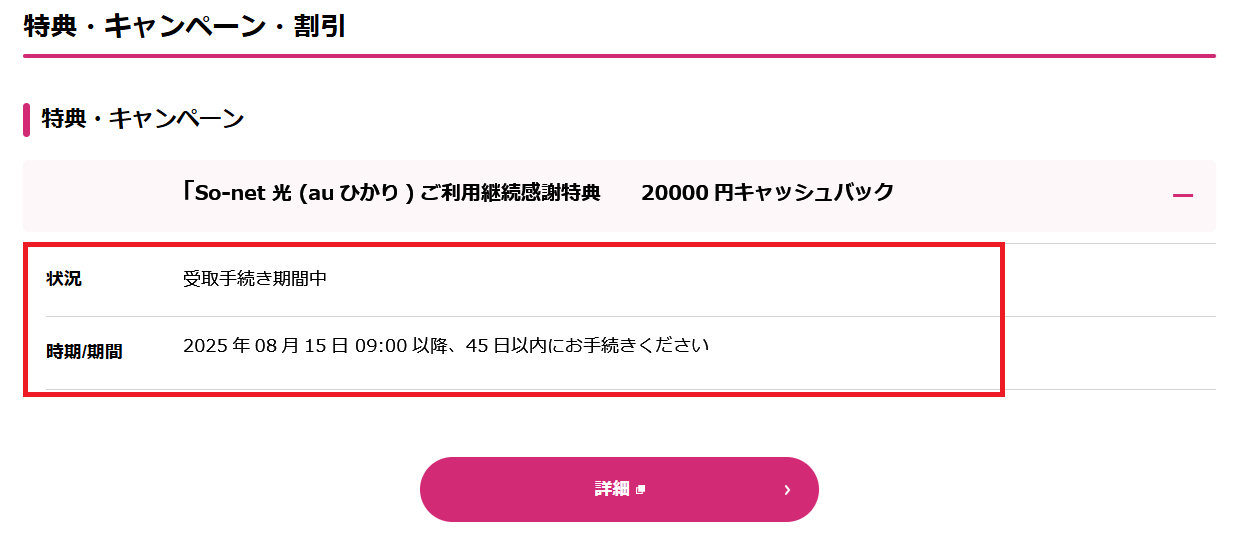 該当のキャッシュバックキャンペーンの「+」をクリックいただくと、下図のようにお受け取り手続き可能期間が表示されます。