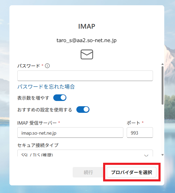 3/11「IMAP」の設定が表示されるため、入力せず「プロバイダーを選択」をクリックします