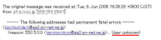 ※ 例: taro_s@aa2.so-net.ne.jp の場合、「aa2.so-net.ne.jp」の部分User unknown (ユーザが存在しない)
