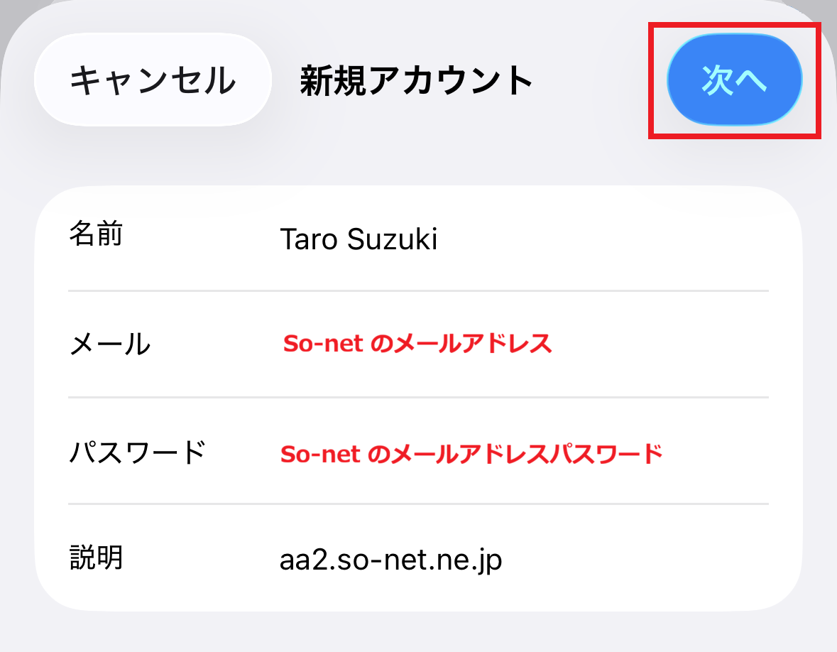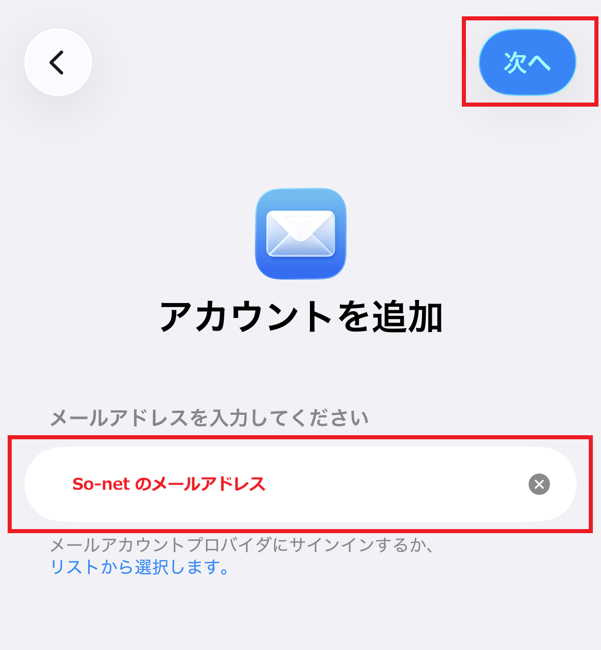 5/17 So-net のメールアドレスを入力し、「次へ」を選択します