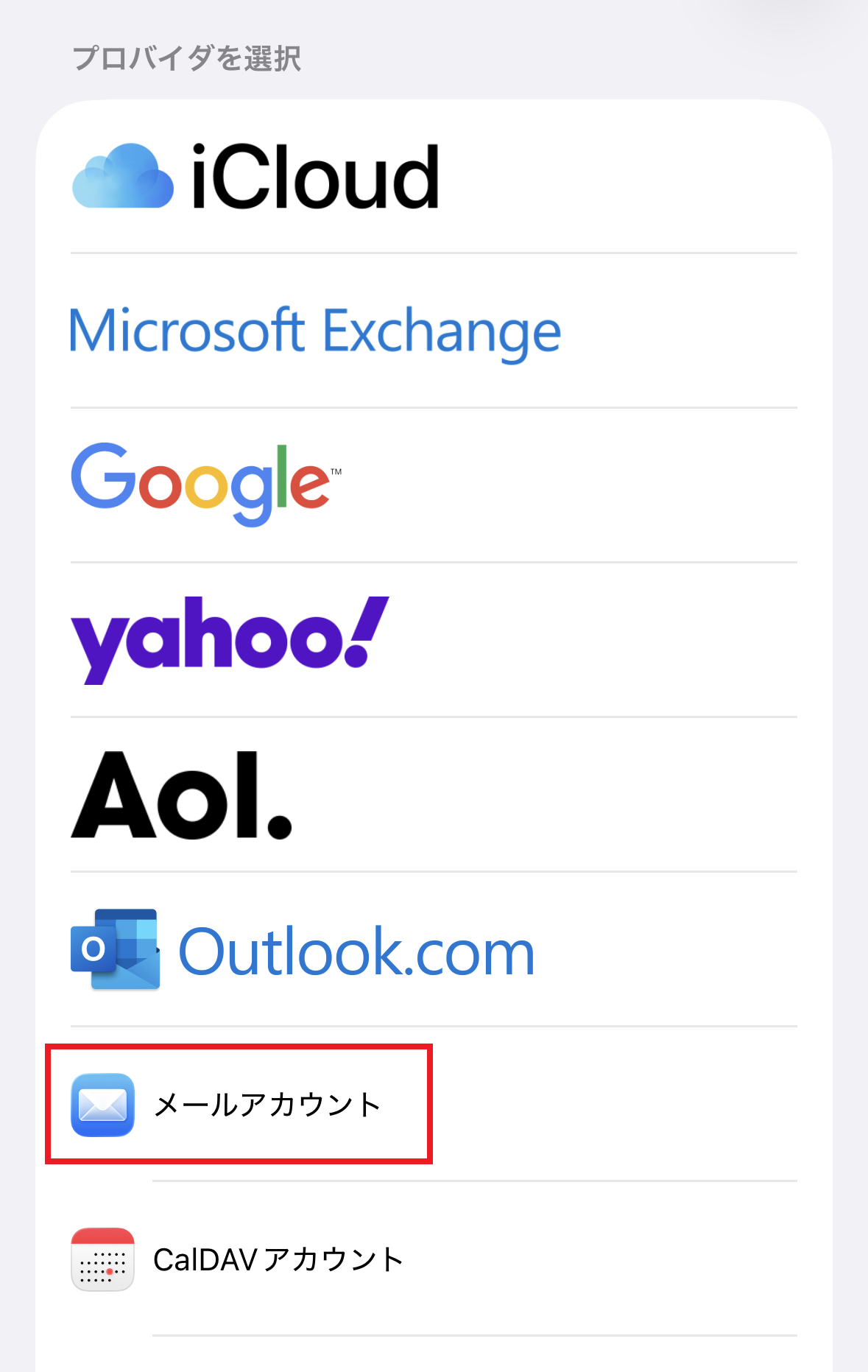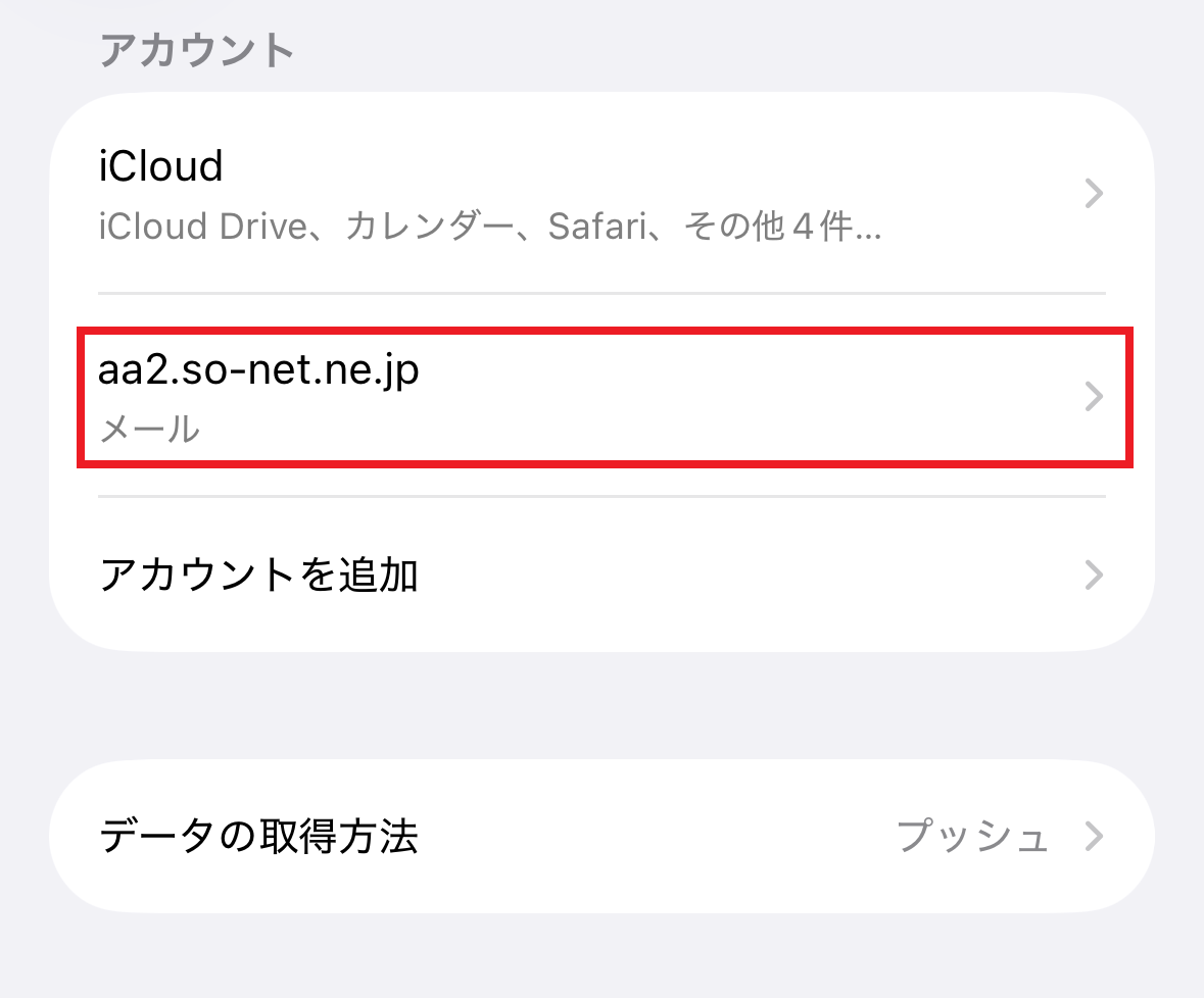 『アプリ』から進まれていない場合は、「アカウント」や「アカウント設定」をタップしてください。3/17 「メールアカウント」をタップします