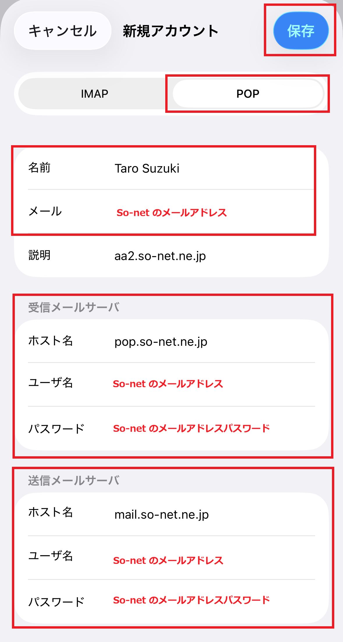 「ユーザ名」: [So-net のメールアドレス] 例) taro_s@aa2.so-net.ne.jp