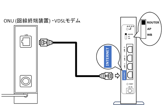 NTT レンタル機器の ONU(回線終端装置) や VDSL モデムにつなぎ、当機器をルーターとして利用する場合はROUTER (ルーターモード) でご利用ください。