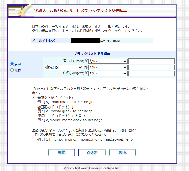 指定した条件のメールに「拒否」の設定をおこなえるため、サーバー側で着信拒否ができ、メールソフトや So-net Web メールにもメールが届かないようにすることができます。