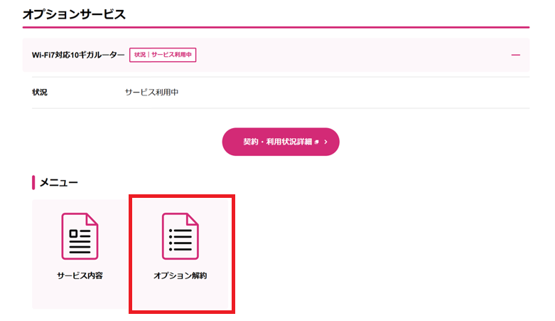2/5 「オプションサービス」より、Wi-Fi7対応10ギガルーターが表示されていることを確認し、「オプション解約」を選択します