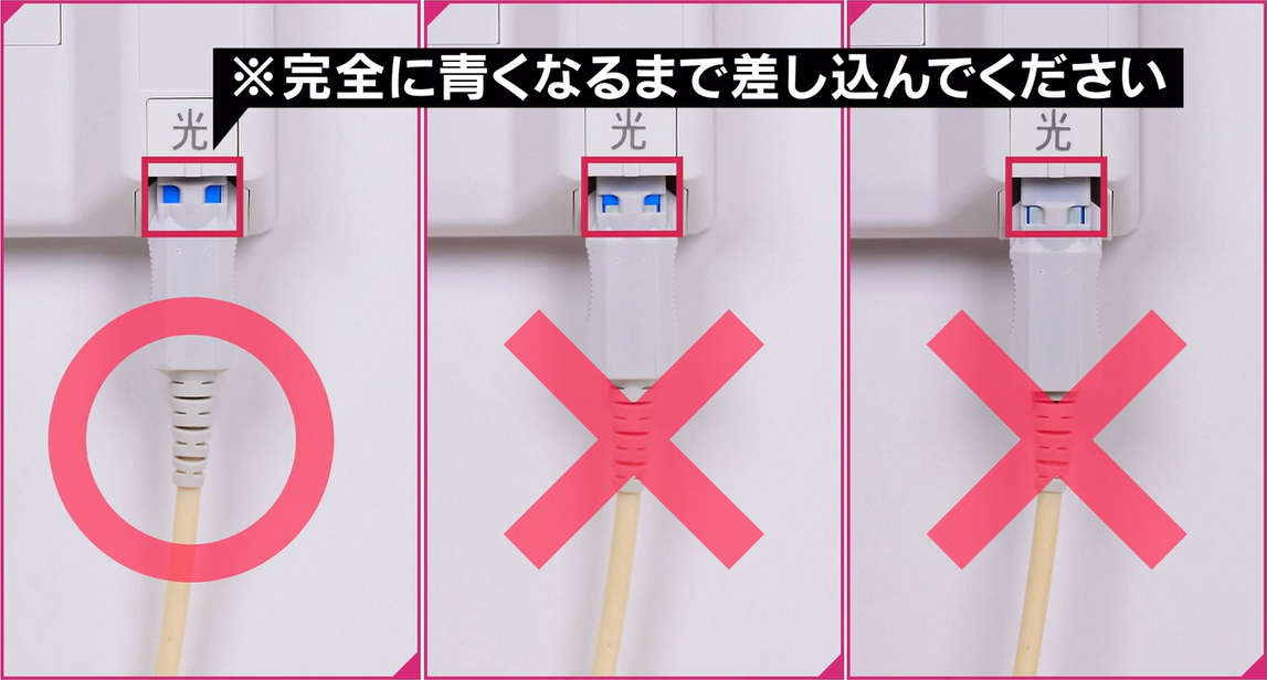 壁の光コンセントにつながっている光ケーブルが抜けていないか、差し込みが甘くなっていないか (カチッとするまで刺さっていないなど) をご確認ください。