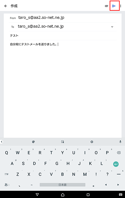 ここでは、メールの送受信をおこなう方法を、『自分宛にテストメールを送って、そのメールを受信する』例を用いてご案内しております。例として SONY Xperia Z4 Tablet にもとづいてご案内しております。