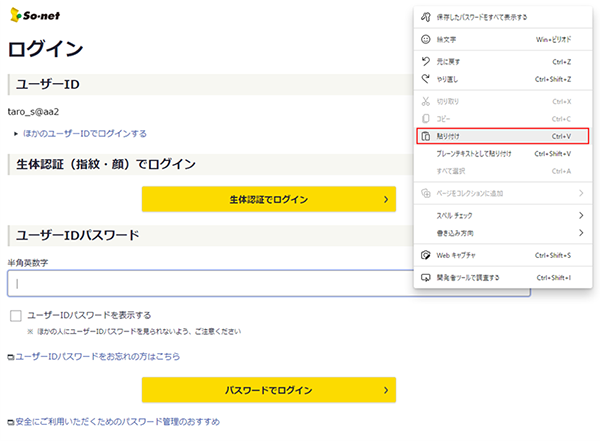 So-net のマイページや手続き画面にログインできないカット & ペーストでログインできない場合