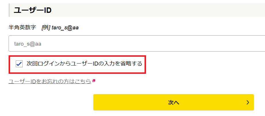 ユーザーID 入力欄下に、『次回のログインからユーザーIDの入力を省略する』というチェックボックスがあります。