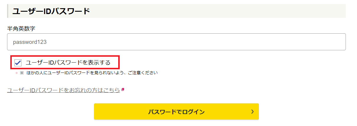 パスワード入力欄下に、『ユーザーIDパスワードを表示する』というチェックボックスがあります。